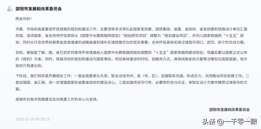 10月16日,邵阳市发改委回复网友咨询时说:“市委、市政府高度重视怀桂铁路的规划和建设工作,主要领导多次带队赴国家发改委、国铁集团、省委、省政府、省发改委和铁路设计单位汇报衔接,请求国家、省支持将怀桂高铁从调整为“规划建设项目”,并列入国家铁路网“十五五”规划,同时从打造世界经典黄金旅游通道的战略高度和填补区域铁路空白的现实需要,支持怀桂高铁采用过境我市洞口、武冈、新宁的东线方案。”