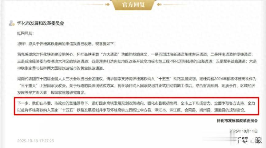 10月11日,怀化市发改委向网友表态:我们紧盯国家高铁发展规划政策动向,强化市县联动协同,全市上下形成合力,全面争取各方支持,全力以赴将怀桂高铁纳入国家“十五五”铁路发展规划并争取怀桂高铁走西线过中方县、洪江市、洪江区、会同县、靖州县、通道县的规划建设。