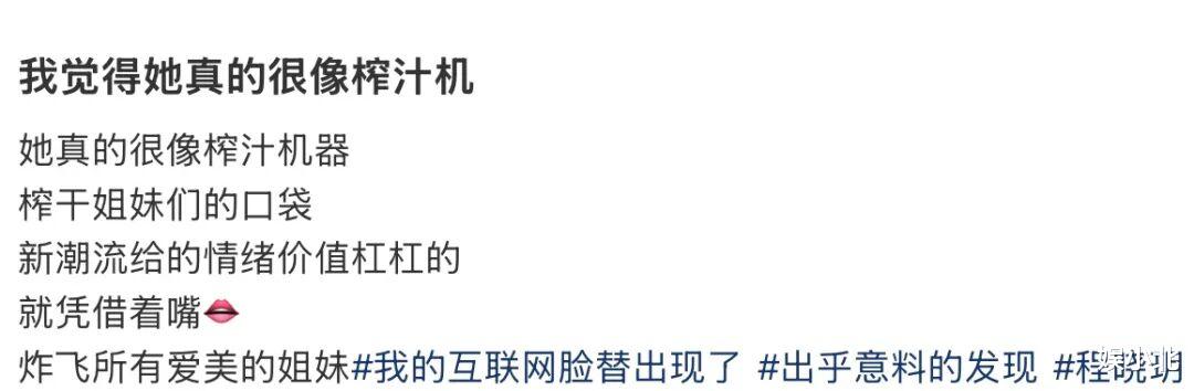 国内赚粉丝钱,国外潇洒消费,产品被质疑抄袭后,程晓玥跟着一起翻车,连“富家女”身份也被质疑。