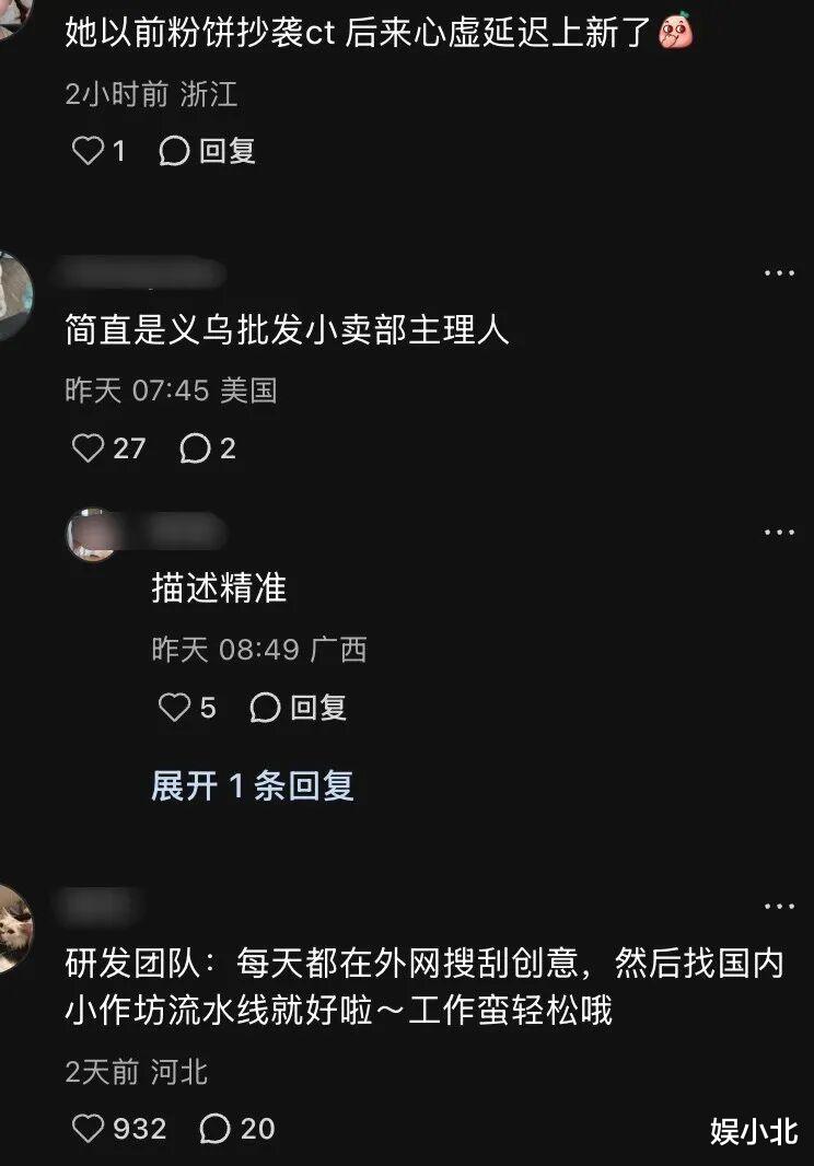 包括她推出的润唇膏,外包装造型与某奢侈品雷同。
