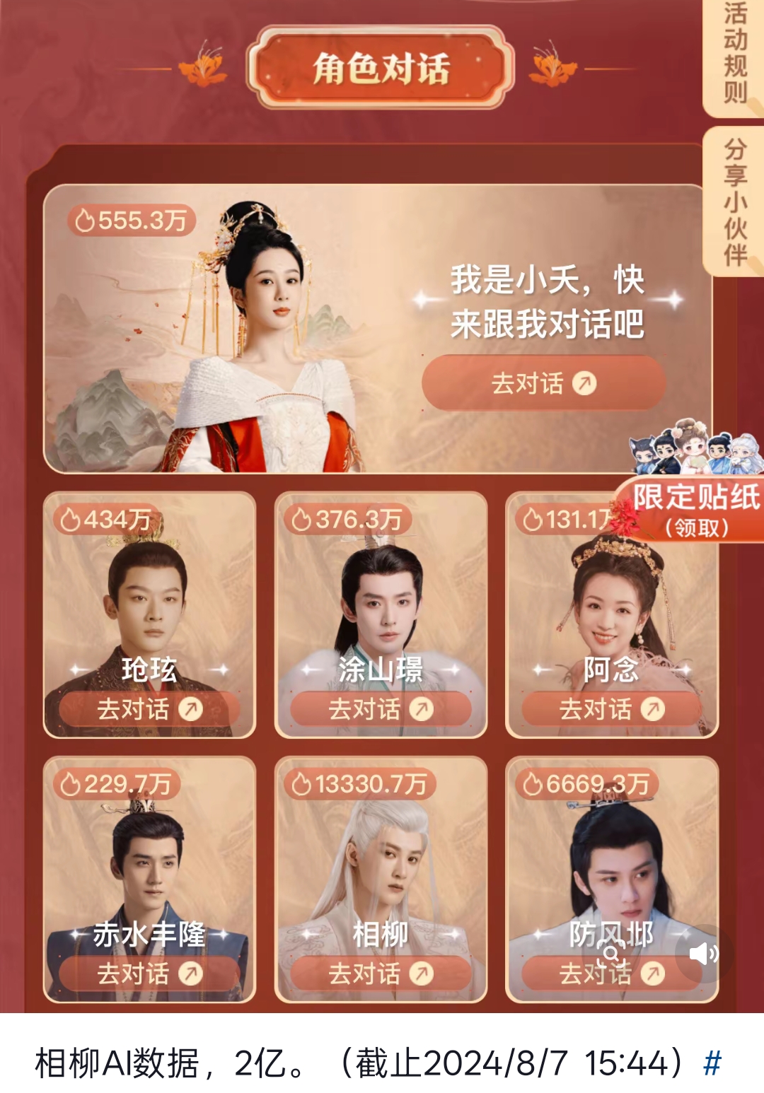 看代言增量看出圈度看模仿看讨论度....还有AI对话那个我当时都震惊了!知道相柳活粉多,没想到会那么多,还真能唠啊!看小檀书还有人跟相柳防风邶唠到现在的,真的无敌能唠!
