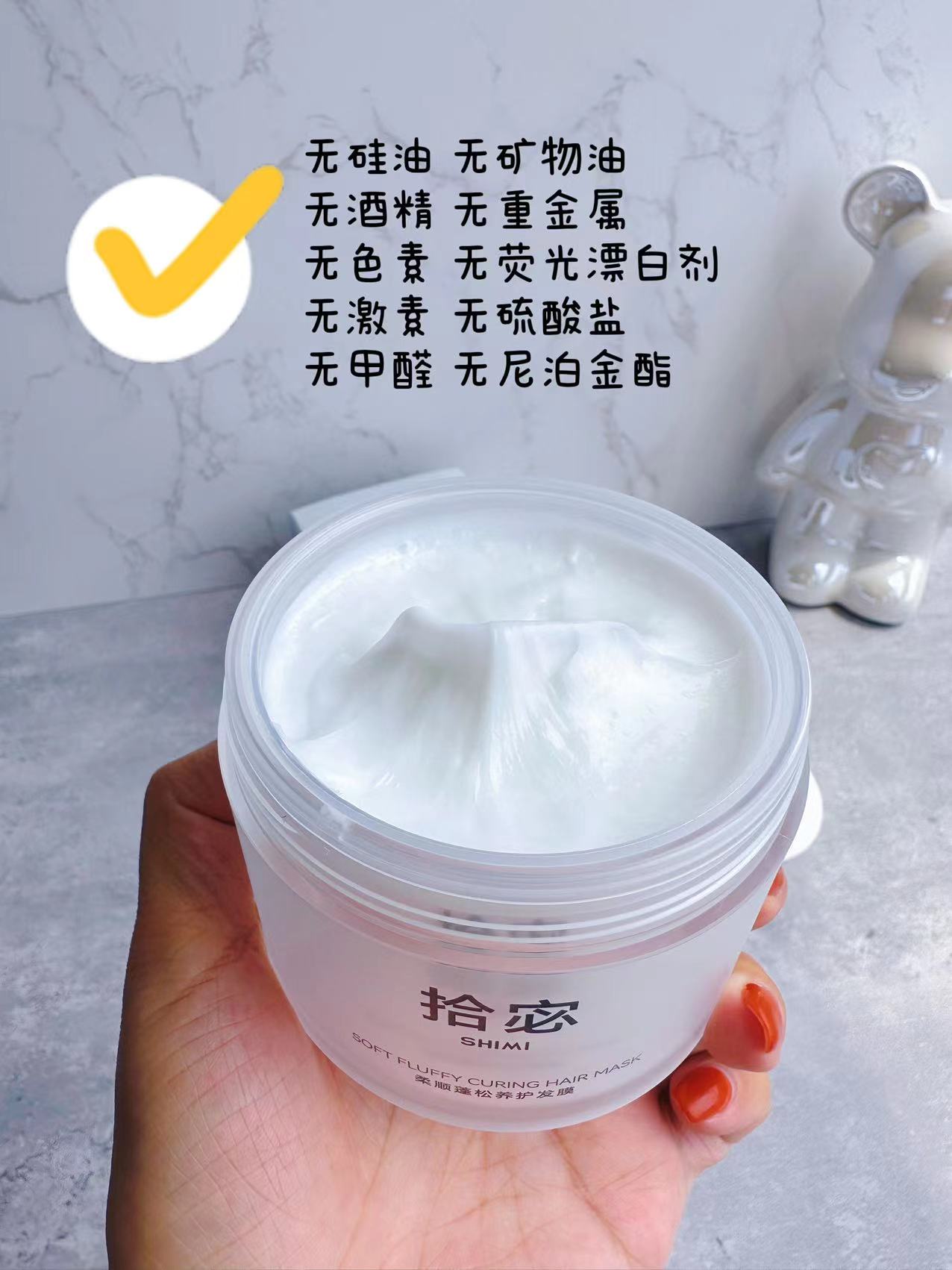 我曾一度怀疑发膜是不是都这样,用完当下顺滑,可吹干后头发反而更干更脆,甚至梳头时断裂更多。后来才知道,有些产品为了快速见效,可能添加了不太好的成分,长期用反而伤发质。但拾宓shimi发膜缺没有这些问题,它把安全温和作为底线,用起来就让人安心不少。这款高端沙龙级免蒸发膜,安全有效,不伤头皮。对我这种又漂又烫的头发来说,它能进行深层修复,不是表面假滑,而是真切抚平毛躁,减少干枯,改善分叉打结。能保持柔顺、亮泽、蓬松感好几天。效果真的不输500+卡诗等大牌发膜,算是难得的效果派。