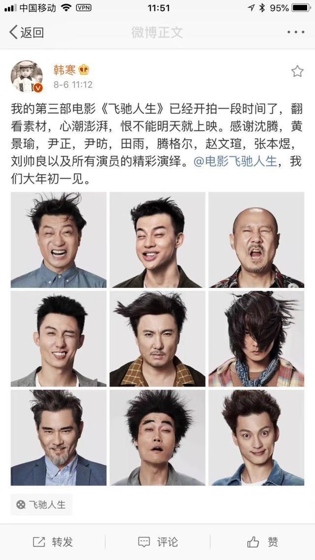 沈腾则在出演一个最会炒饭的赛车手,电影增加了这么一个自带喜感的演员,更加增加了电影的色彩,对于《飞驰人生》,韩寒在微博中写道:“我的第三部电影《飞驰人生》已经开拍一段时间了,翻看素材,心潮澎湃,夜不能寐,日不能睡,恨不能明天就上映。”