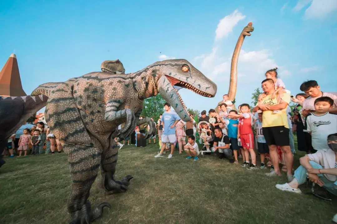 祥源花世界侏罗纪小镇内,1:1 动态机械恐龙与非遗打铁花、星空长廊交织,成为今夏爆款 “恐龙王国”,成为肥西文旅的 “流量密码”。