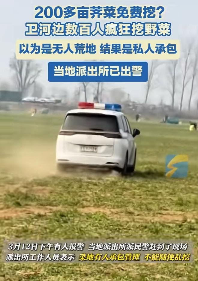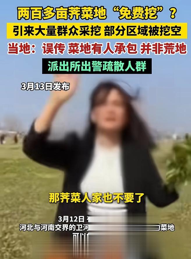 从现场视频看到,现场人数可以用人山人海来形容了,原本绿油油的菜地很快就被薅成了荒地,许多人都沉浸在免费挖野菜的喜悦中。