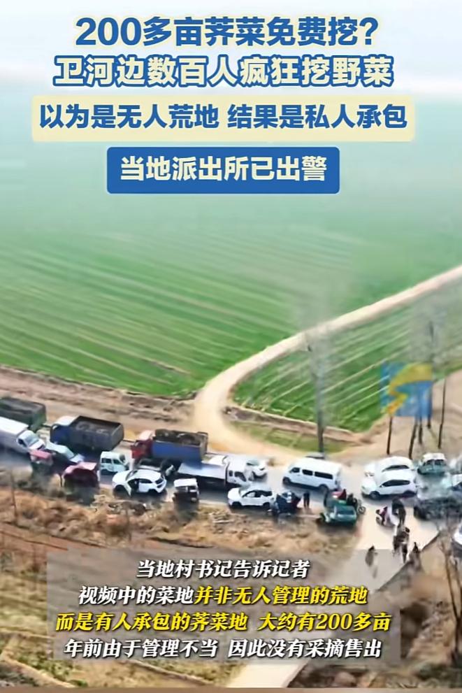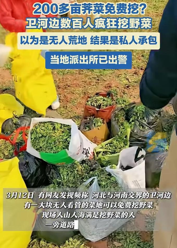 事情发生在近日邯郸张二庄镇北善村,这几天有网友在社交媒体发视频称,该村里有二百多亩荠菜地没人管,可以免费采挖。