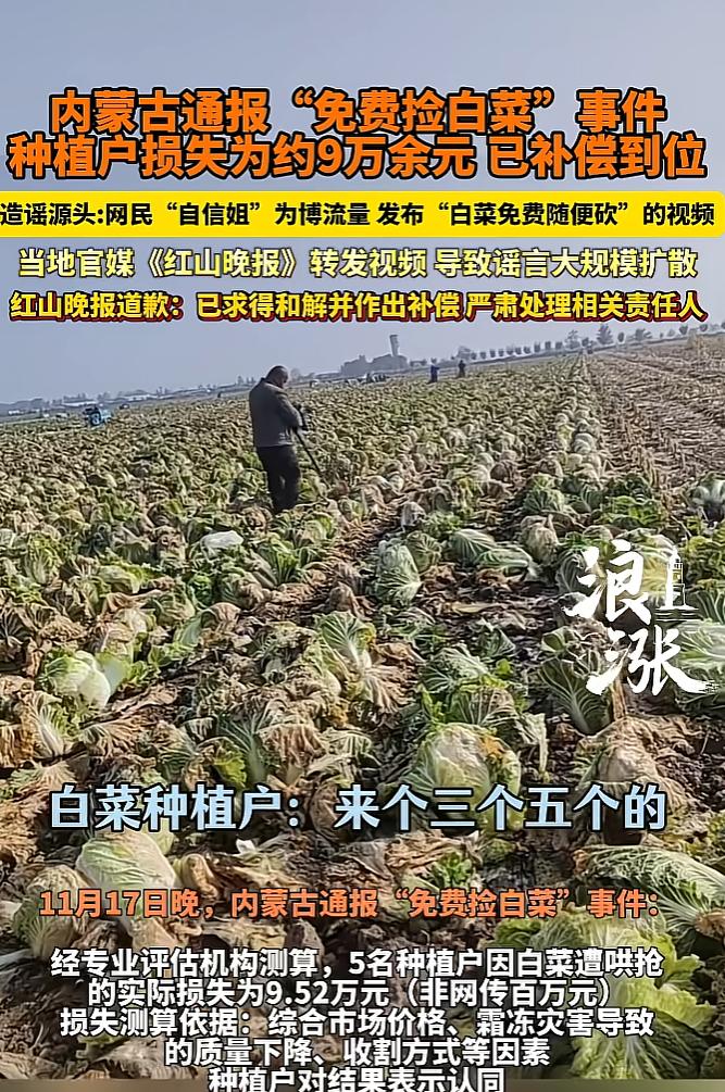 早在几个月之前,内蒙古赤峰就发生过类似事件,网友为博流量发布几百亩大白菜免费挖的造谣视频,视频内容经过媒体报道后,瞬间激发了网友们的热情,数百人冲进菜地里抢菜,菜农根本控制不住,最终损失近十万元,事后造谣者被治安处罚,并承担民事责任。