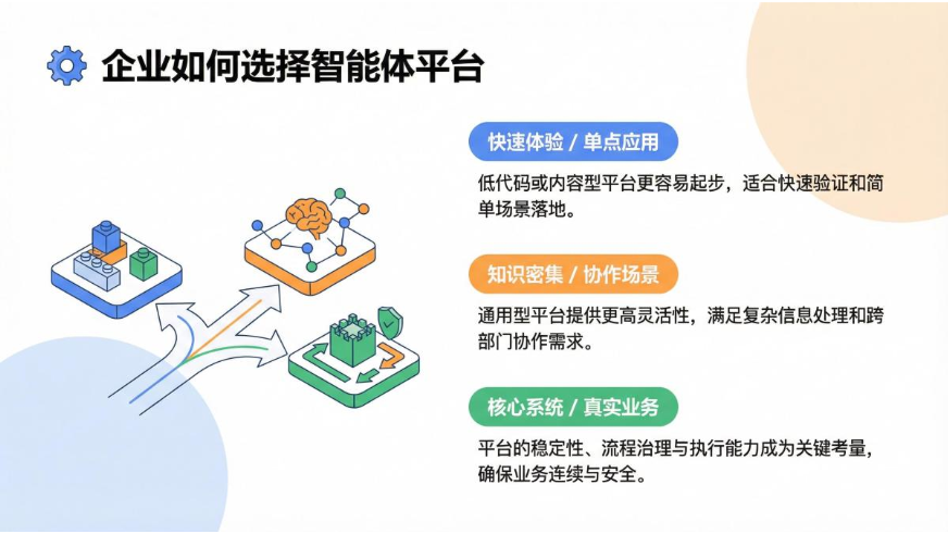 如果目标是快速体验或单点应用,低代码或内容型平台更容易起步;如果涉及知识密集或协作场景,通用型平台更具灵活性;如果智能体需要进入核心系统、承担真实业务任务,那么平台的稳定性、流程治理与执行能力将成为关键考量。