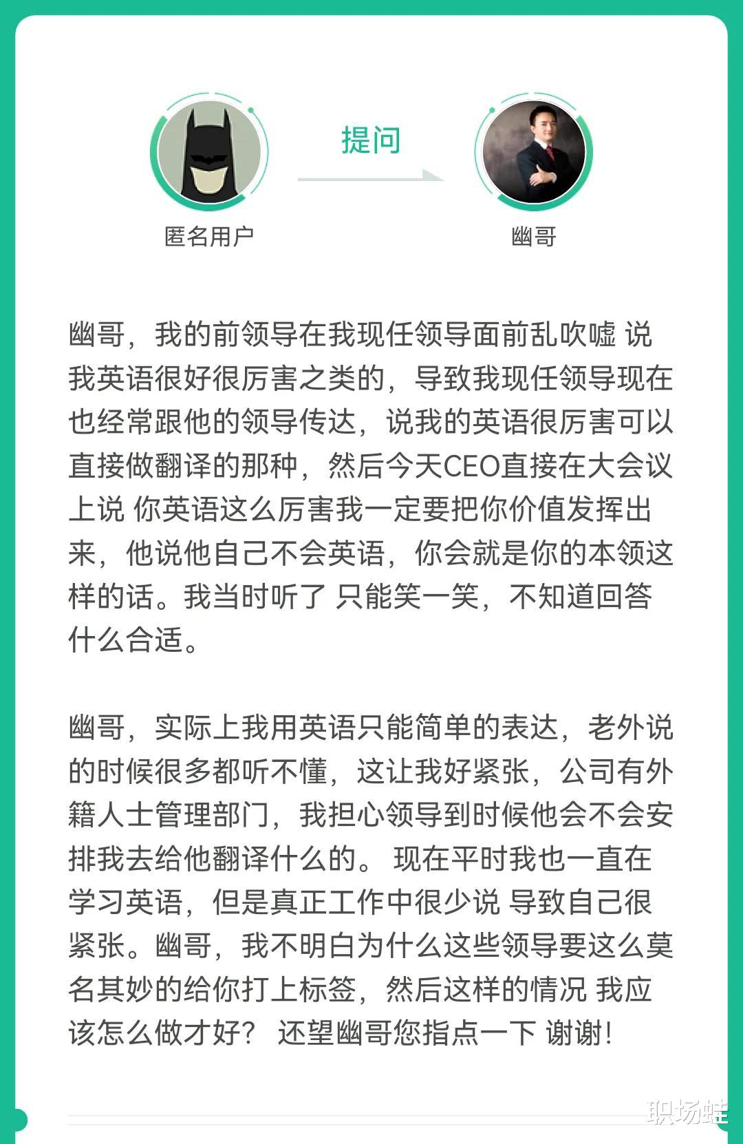 “幽哥,我的前领导在我现任领导面前乱吹嘘 说我英语很好很厉害之类的,导致我现任领导现在也经常跟他的领导传达,说我的英语很厉害可以直接做翻译的那种,”