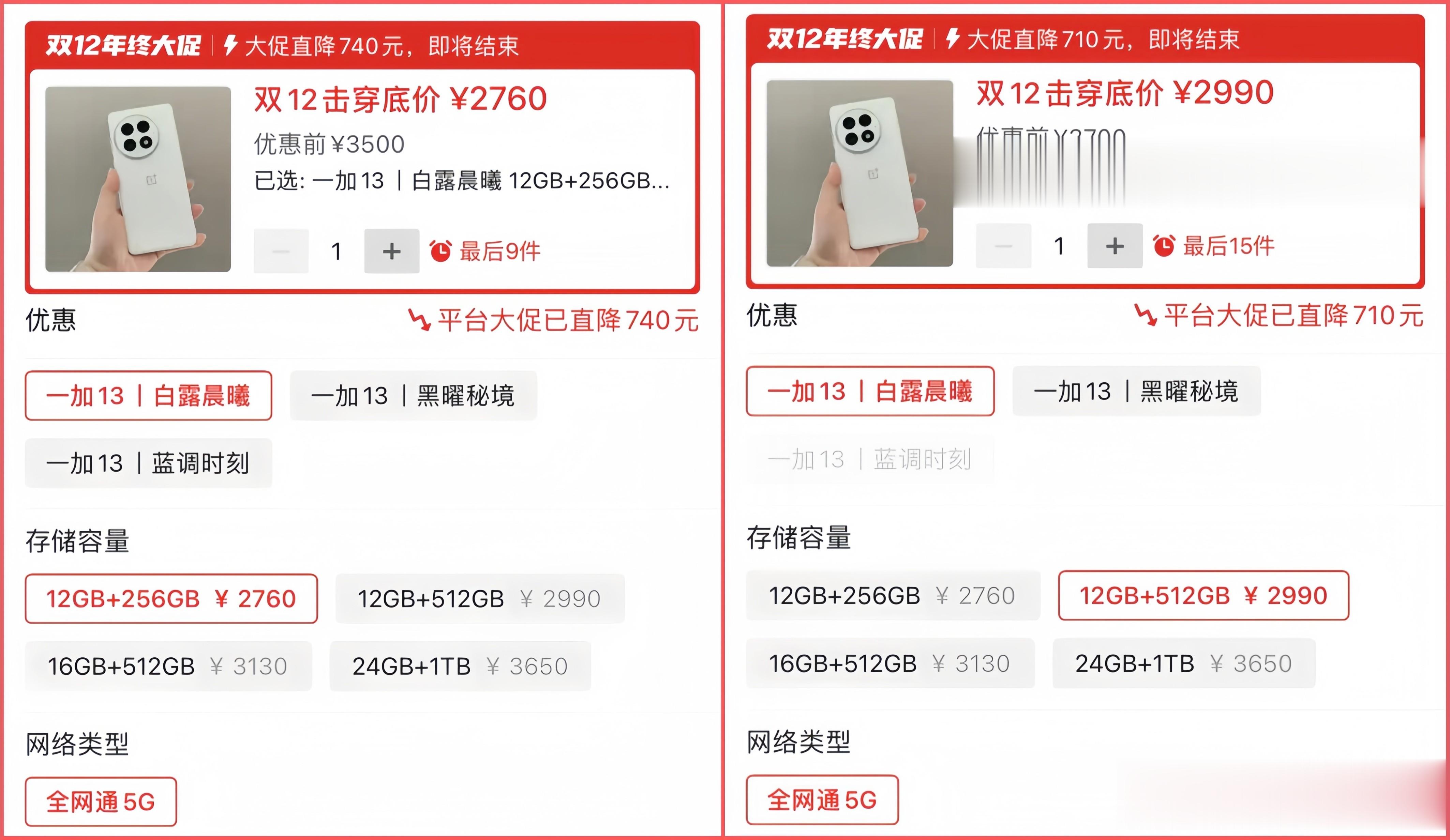 三、一加13发布时间为2024年的10月31日,首发起步价为4499,最高配置版本售价为5999;现在降到了2760左右。