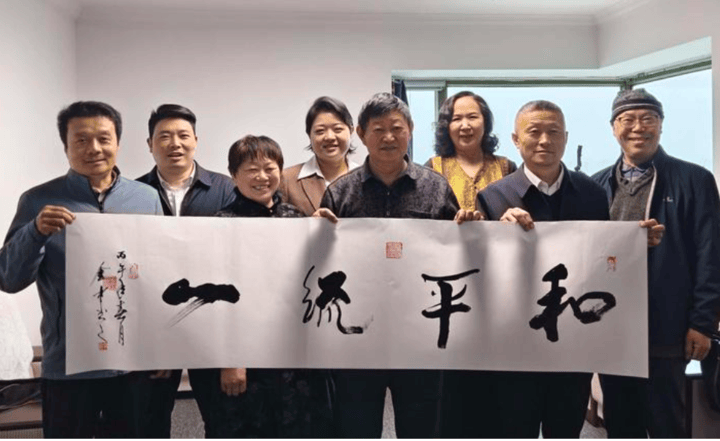 图:卫报中文网总编辑、《华夏新闻报》副社长刘永、中国著名书法家金中、“中国一笔画”艺术家周中华等“两会记者走基层”活动成员,共同祝愿宝岛台湾“和平统一”。