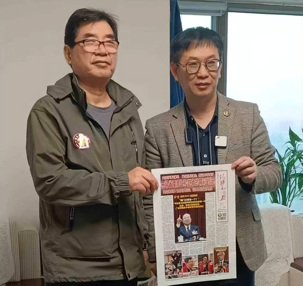 图:台湾《华夏新闻报》两会记者与共工新闻社副社长、全国两会记者王群在人民大会堂。