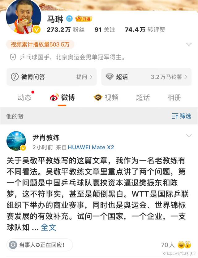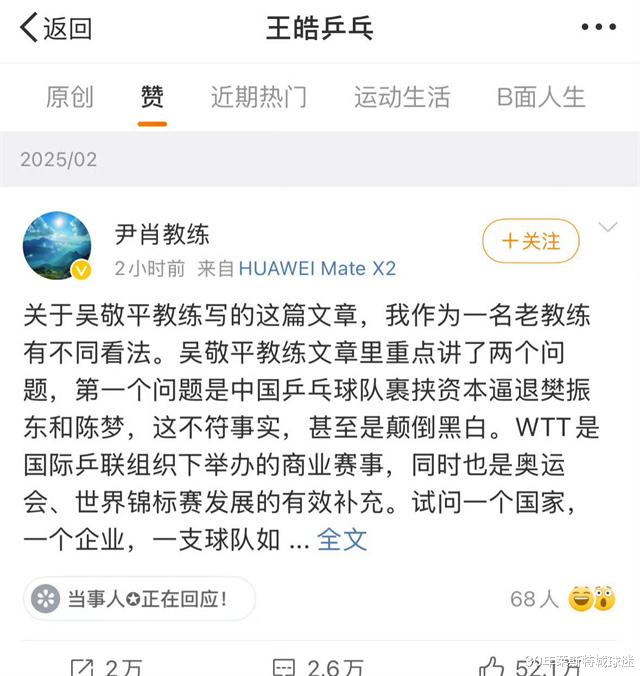 2月15日,可谓是国乒“剑气之争”正式拉开序幕的一天,樊振东恩师吴敬平炮轰国乒被WTT资本裹挟等丑闻后,他的昔日同事、刘国梁恩师尹肖赶紧认证账号并进行发声驳斥,引发了国乒名宿们的纷纷表态。