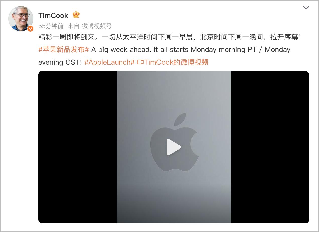 除了 X 平台外,库克在国内微博账号也同步预告了具体时间——北京时间周一晚间。