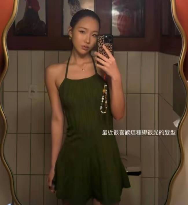 许曦文在社交平台晒美照,小麦肤色、挂脖吊带裙、大光明造型、烟熏妆、连手机壳都是豹纹系,妥妥的欧美辣妹。
