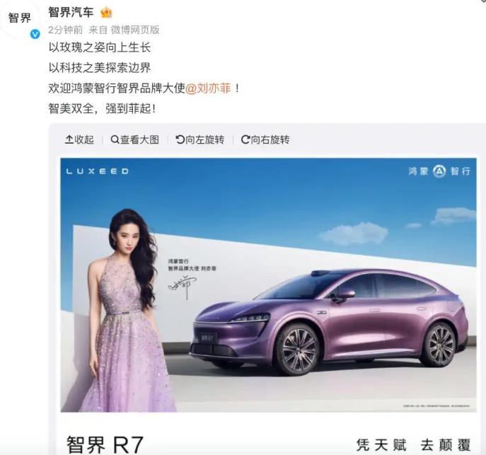 近日,智界汽车官方发布了欢迎刘亦菲成为其品牌大使的消息。
