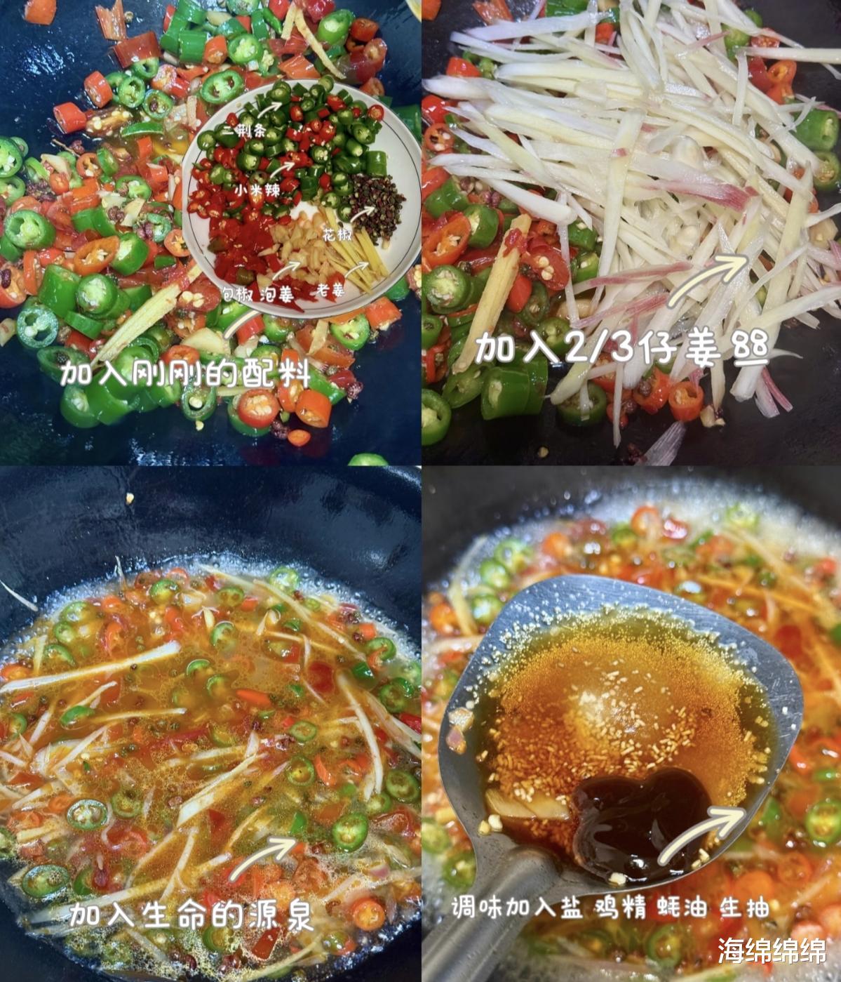 锅中留底油,先下入花椒、老姜、泡姜和泡椒炒出香味,再加入二荆条和小米辣翻炒,让辣味充分释放。随后,倒入约三分之二的仔姜丝,快速翻炒几下,加入适量的清水,调入盐、鸡精、蚝油和生抽,煮开后转中小火煮2-3分钟,让汤汁的味道更加浓郁。
