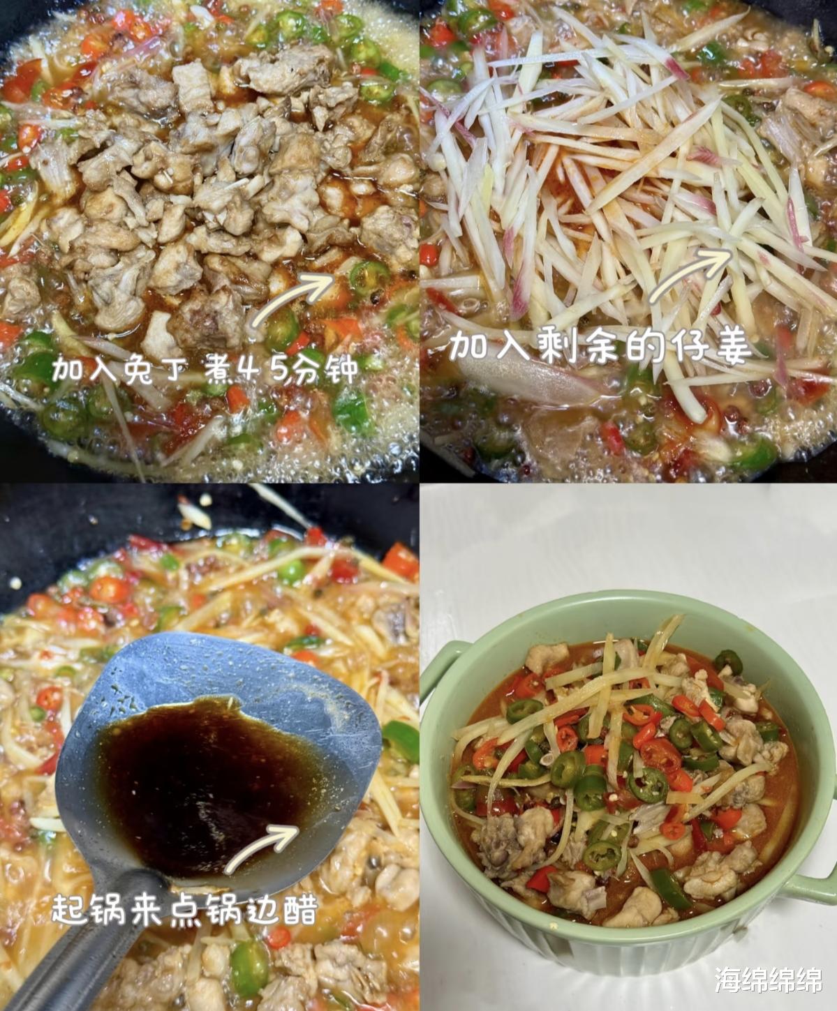 将炸好的兔肉丁倒入锅中,与汤汁和配料充分混合,煮4-5分钟,让兔肉充分吸收汤汁的鲜辣。接着,加入剩余的仔姜丝,快速翻炒均匀,让仔姜的鲜辣味在出锅前达到顶峰。最后,沿着锅边淋入少许醋,醋的酸香能瞬间激发菜肴的复合香味,让整道菜的味道更加立体。