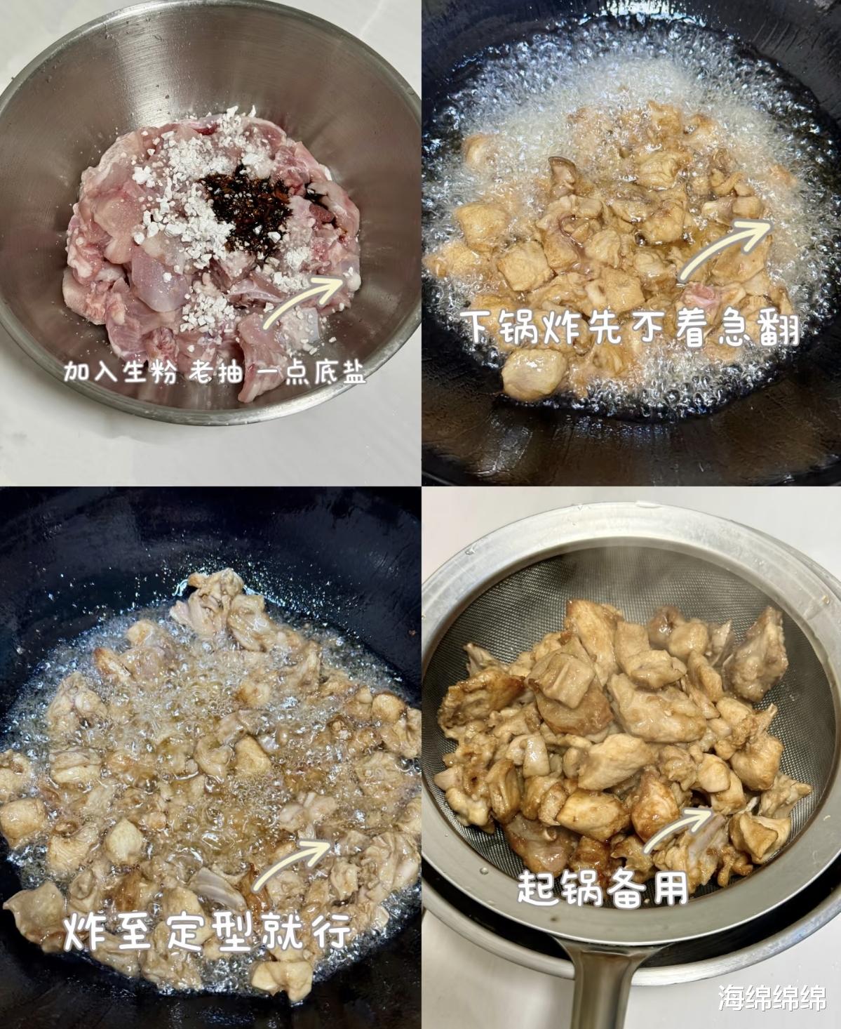 腌制好的兔肉,需要用清水冲洗干净,沥干水分后,加入少许生粉、老抽和底盐抓匀,让每一块兔肉都均匀裹上薄浆。这一步能让兔肉在后续的炸制中锁住水分,保持嫩滑的口感。接着,锅中倒入足量的油,油温烧至六成热时,将兔肉丁下锅,先不要着急翻动,待其定型后再轻轻拨散,炸至表面微黄、肉质紧实后捞出备用。