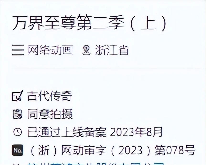 目前《万界至尊第二季(上)》篇章已经通过了上线审核,备案号为(浙)网动审字(2023)第078号,