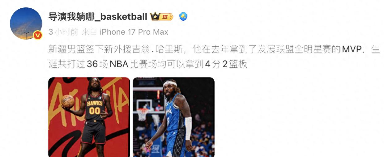 哈里斯是NBA的猛将,去年在发展联盟拿到了全明星赛的mvp,生涯共打过36场比赛,场均可以拿到4分2篮板。但是在发展联盟的表现还是很不错的,希望来到了CBA能够继续打出这样的状态,帮助新疆队,目前的新疆队的外援实在太差,只有纳托尔和劳森才符合新疆队的阵容。