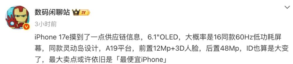 博主@数码闲聊站 的一份消息中曾提到过,供应链信息显示iPhone 17e将配备6.1英寸OLED屏,大概率是16同款60Hz低功耗屏幕,同款灵动岛设计,前置12Mp+3D人脸,后置48Mp,ID也算是大变了,最大卖点或许依旧是「最便宜iPhone」。