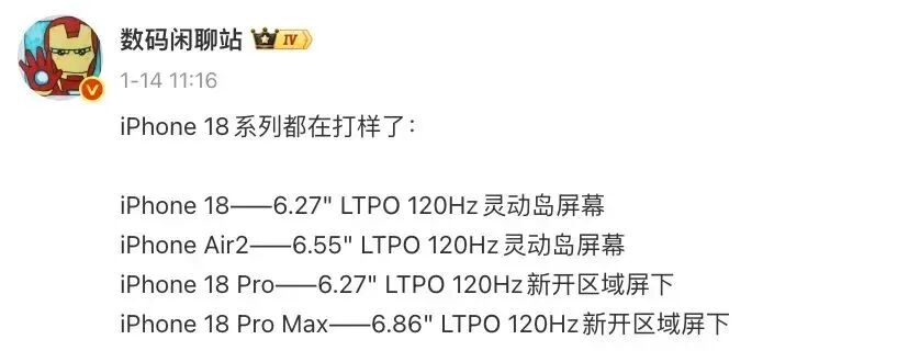 产品细节方面,相关爆料显示,iPhone 18系列都在打样。其中,iPhone 18将配备6.27英寸的 LTPO 120Hz灵动岛屏幕、iPhone Air2配备6.55英寸的 LTPO 120Hz灵动岛屏幕。