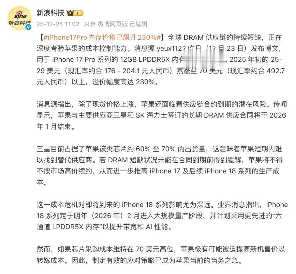 参考新浪科技的报道来看,“用于 iPhone 17 Pro 系列的 12GB LPDDR5X 内存芯片价格已从 2025 年初的 25-29 美元(约合人民币 175 - 203 元)暴涨至 70 美元(约合人民币 490 元)以上,溢价幅度高达 230%。”