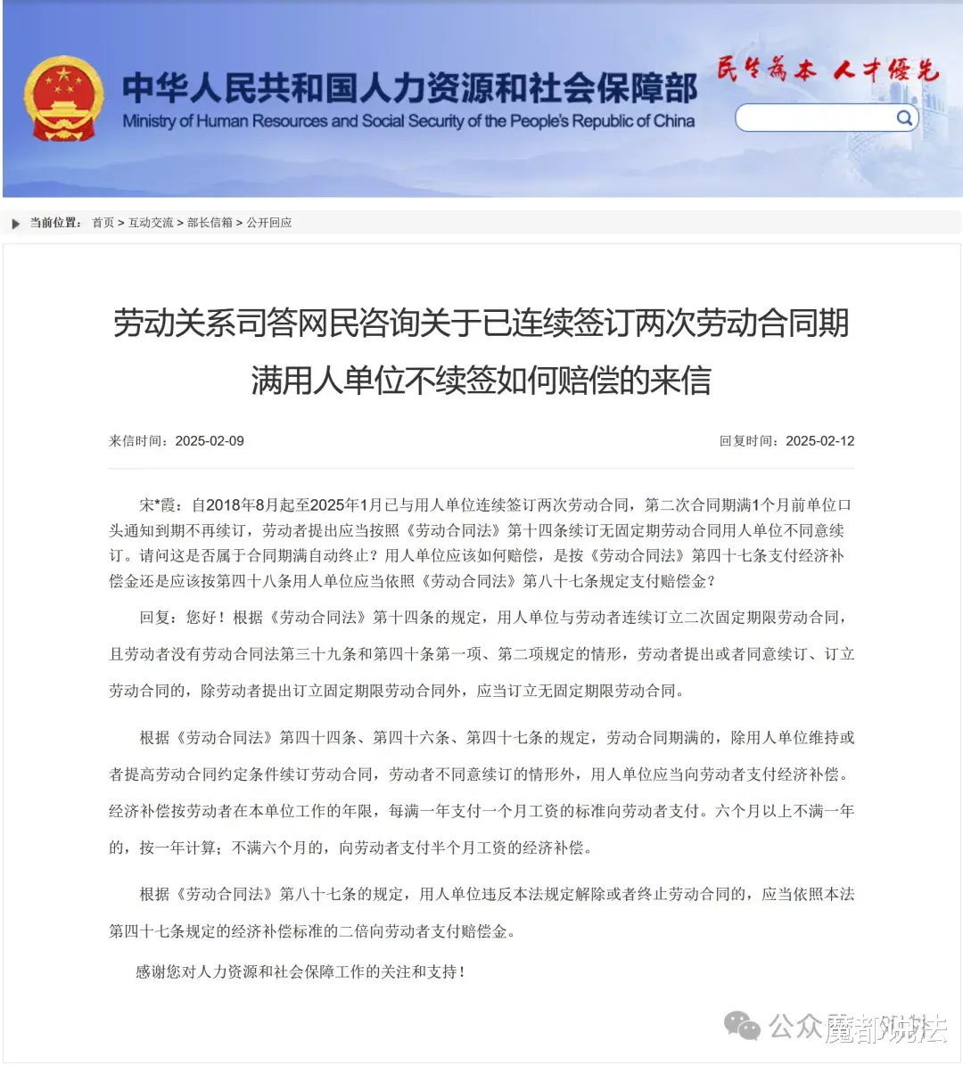 宋*霞:自2018年8月起至2025年1月已与用人单位连续签订两次劳动合同,第二次合同期满1个月前单位口头通知到期不再续订,劳动者提出应当按照《劳动合同法》第十四条续订无固定期劳动合同用人单位不同意续订。请问这是否属于合同期满自动终止?用人单位应该如何赔偿,是按《劳动合同法》第四十七条支付经济补偿金还是应该按第四十八条用人单位应当依照《劳动合同法》第八十七条规定支付赔偿金?