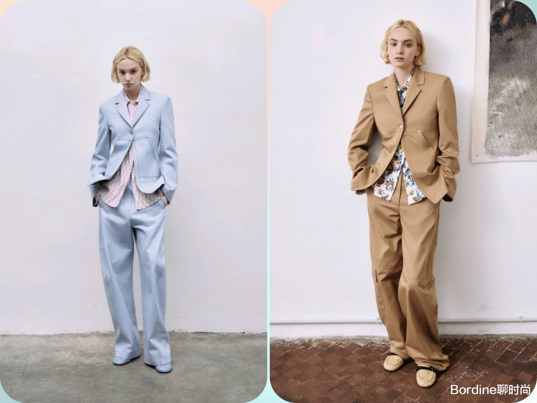 西服套装在纯色的简约大方中,宽松廓形增加了直线的利落感,还在浅蓝色、棕色等颜色的低调大方中也有几分清新的柔和感;而在和花纹内搭之间的搭配,视觉的对比也让西服套装更多了鲜明清晰的层次感。