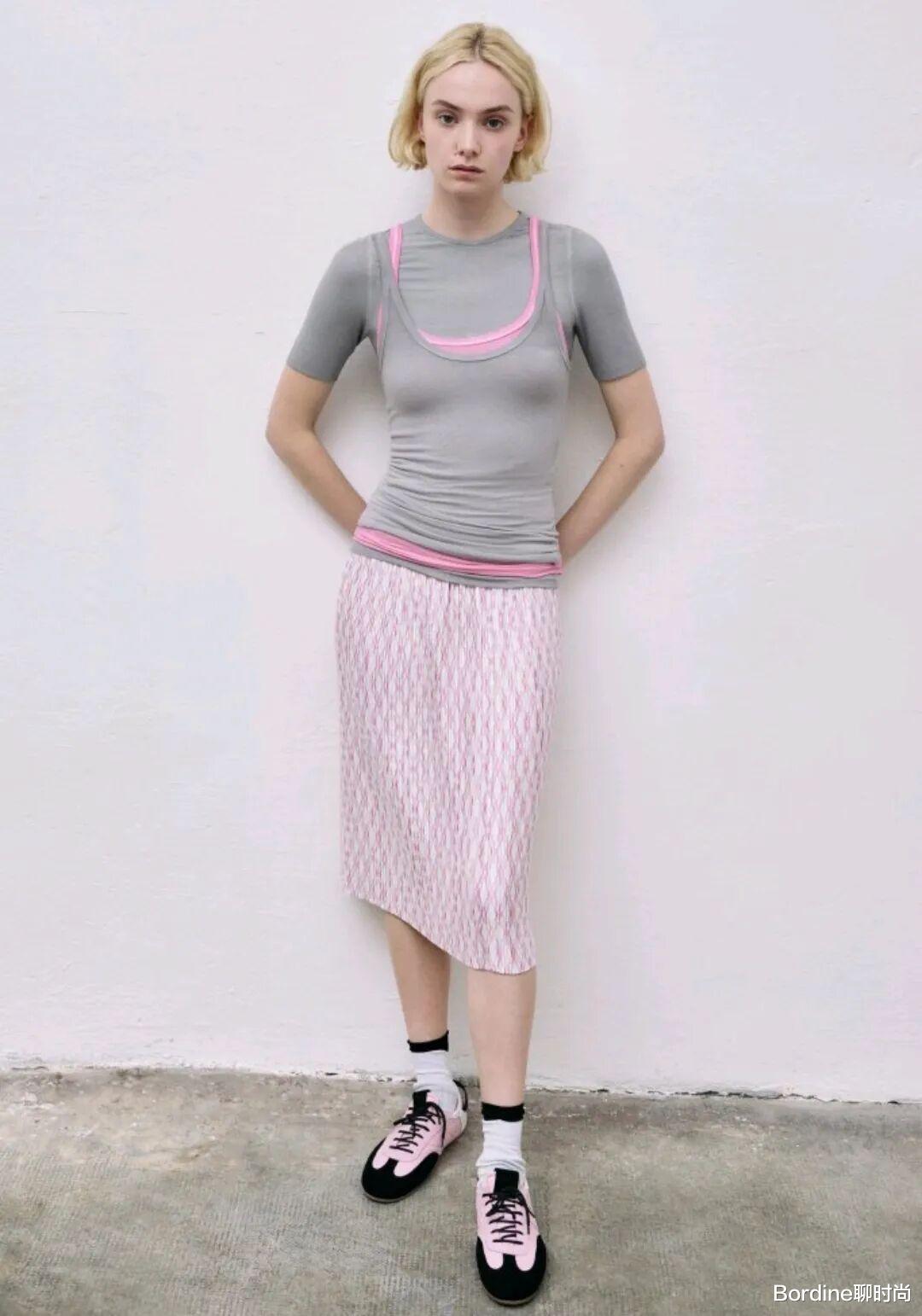 灰色的修身短袖上衣在和吊带背心的结合中,一些少量粉色颜色的出现,则在视觉的对比中有着更为鲜明的层次感,以粉色花纹的直筒裙进行搭配,休闲也优雅。