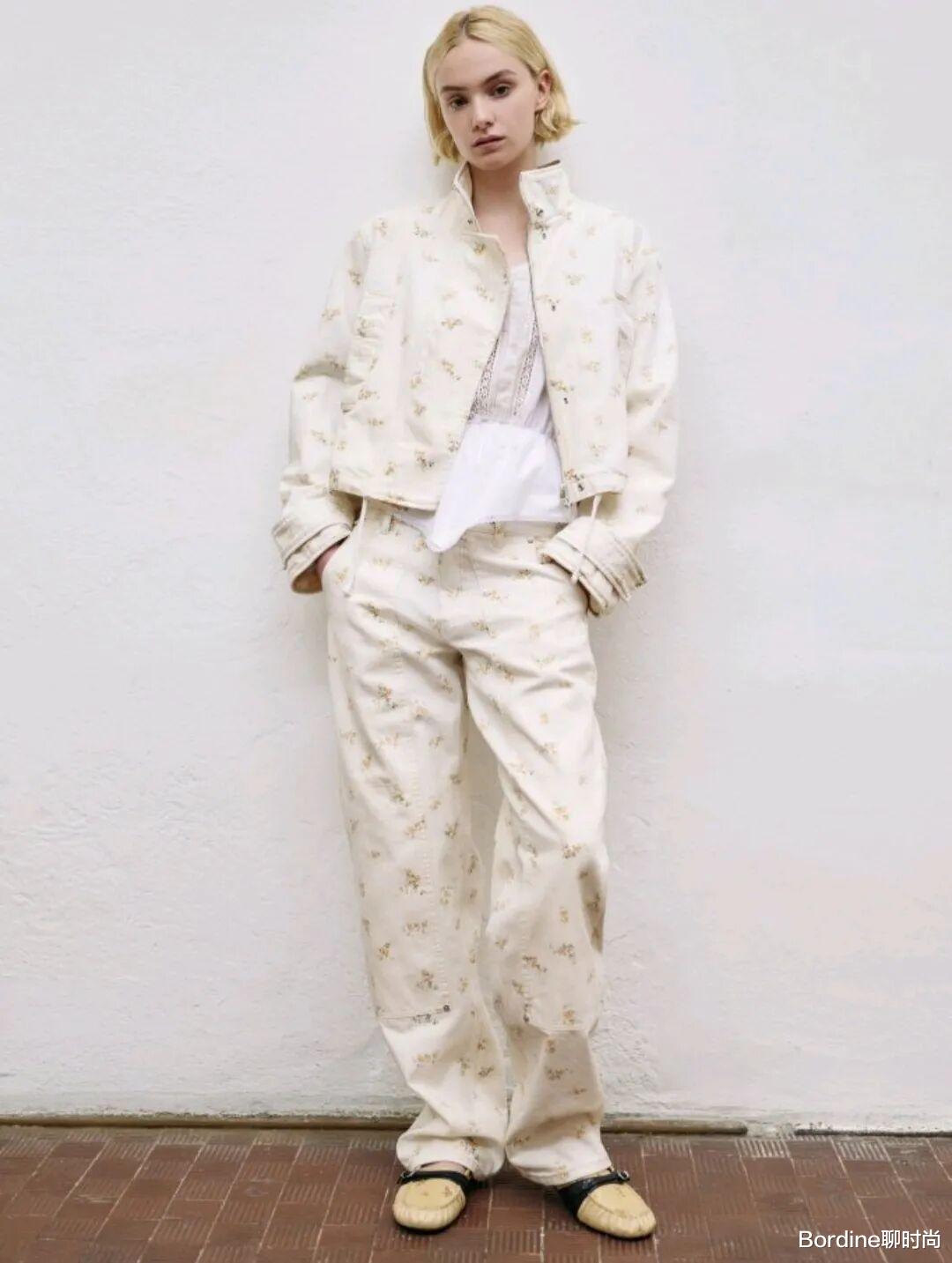 夹克和直筒裤搭配形成的套装上,宽松廓形增加了直线线条的利落舒适感,而白色颜色作为底色的时候,在和彩色的对比增加了碎花图案的浪漫活力气质。