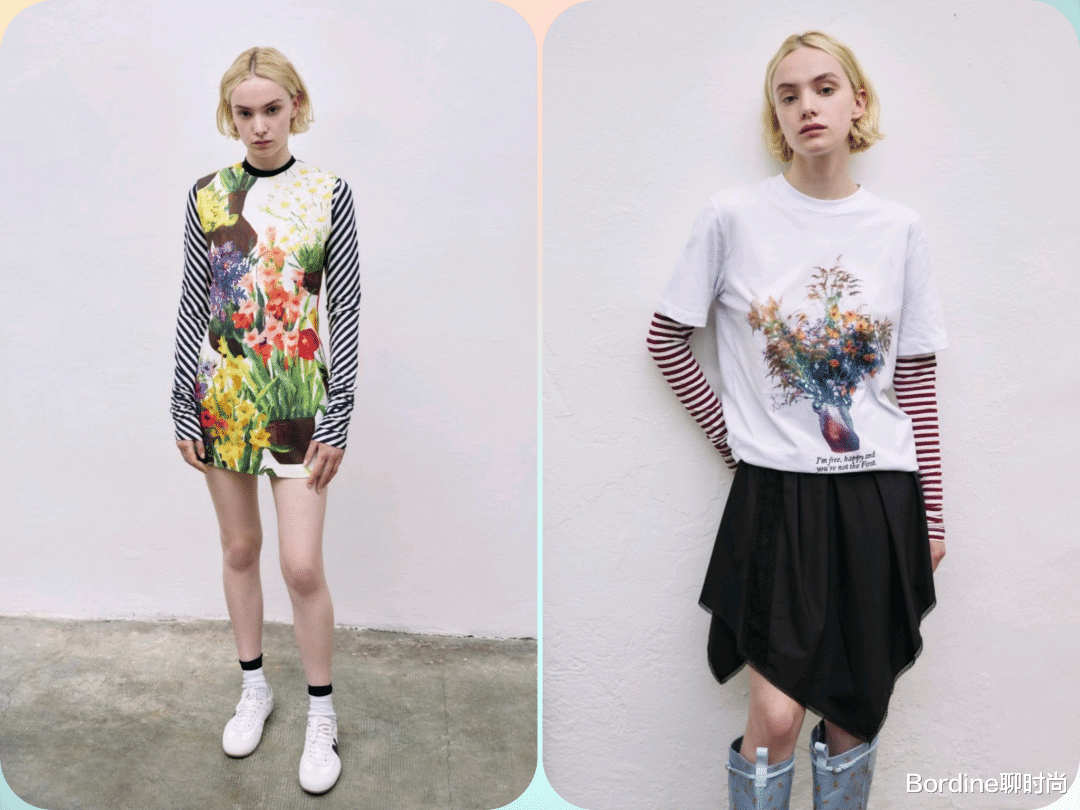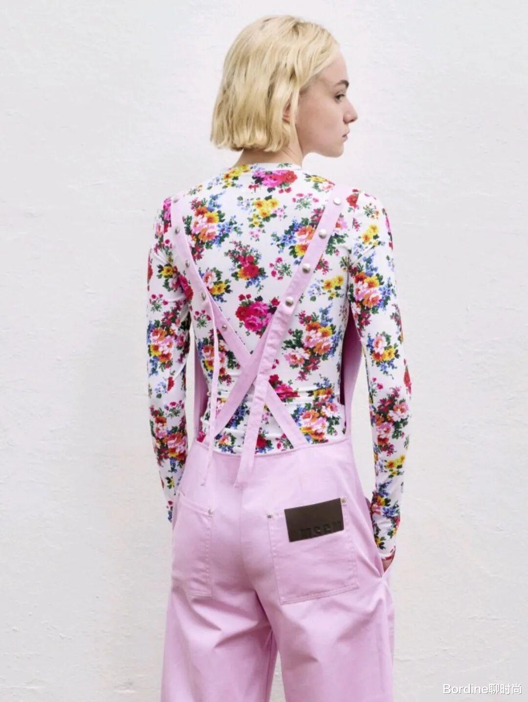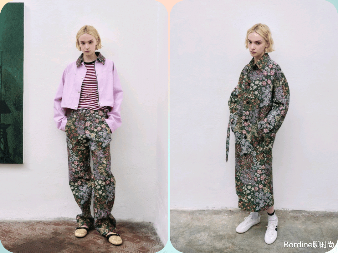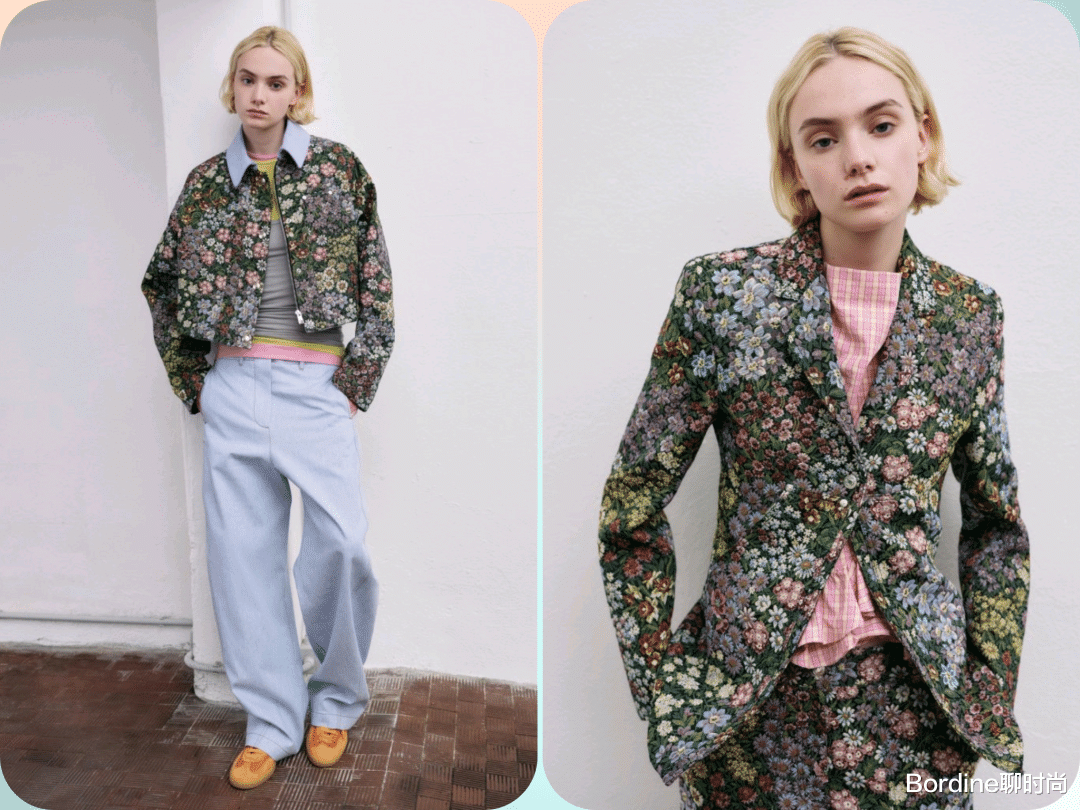 这些浪漫活力的花纹在直筒裤、休闲服装等款式之上,以宽松廓形的直线也多了一些利落的舒适感,还在和粉色条纹内搭、粉色的夹克外套、小白鞋等之间的搭配中,带来更多撞色冲击的对比,清新也更优雅时尚。