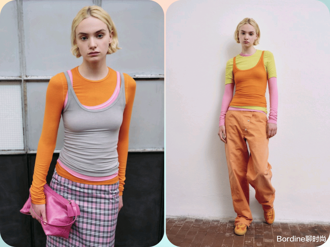 休闲的服装在鲜艳的橙色、黄色和粉色、灰色等这些色彩之间的搭配之上,色彩之间的对比让撞色的效果更为强烈,还有修身的内搭增加了腰身曲线的温婉柔和,而背心等元素的出现,在层次中更多休闲时髦感。