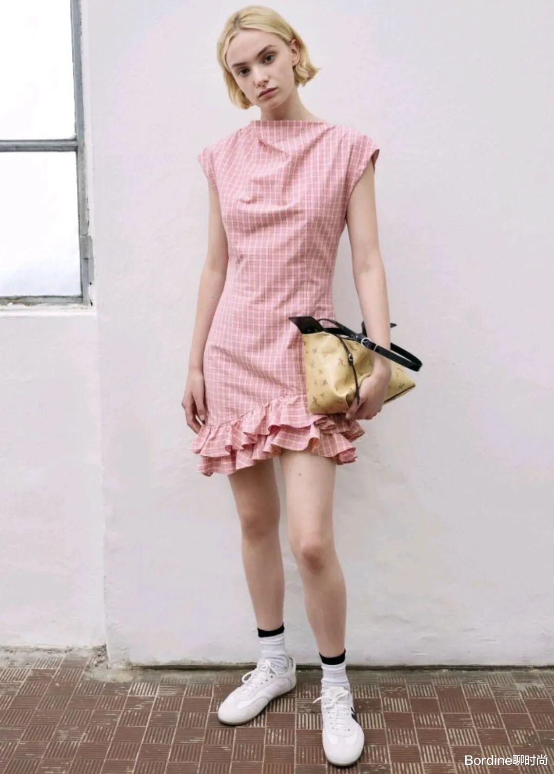 无袖的连衣裙在腰身的位置结合了一些收腰的设计,增加了一些腰身曲线的温婉柔和感,而粉色颜色的柔和粉嫩也在和白色之间的搭配,带来了色彩的对比冲击,为裙装增加了格纹图案的简约经典,在裙摆的位置,以荷叶边的拼接增加了一些细节感。