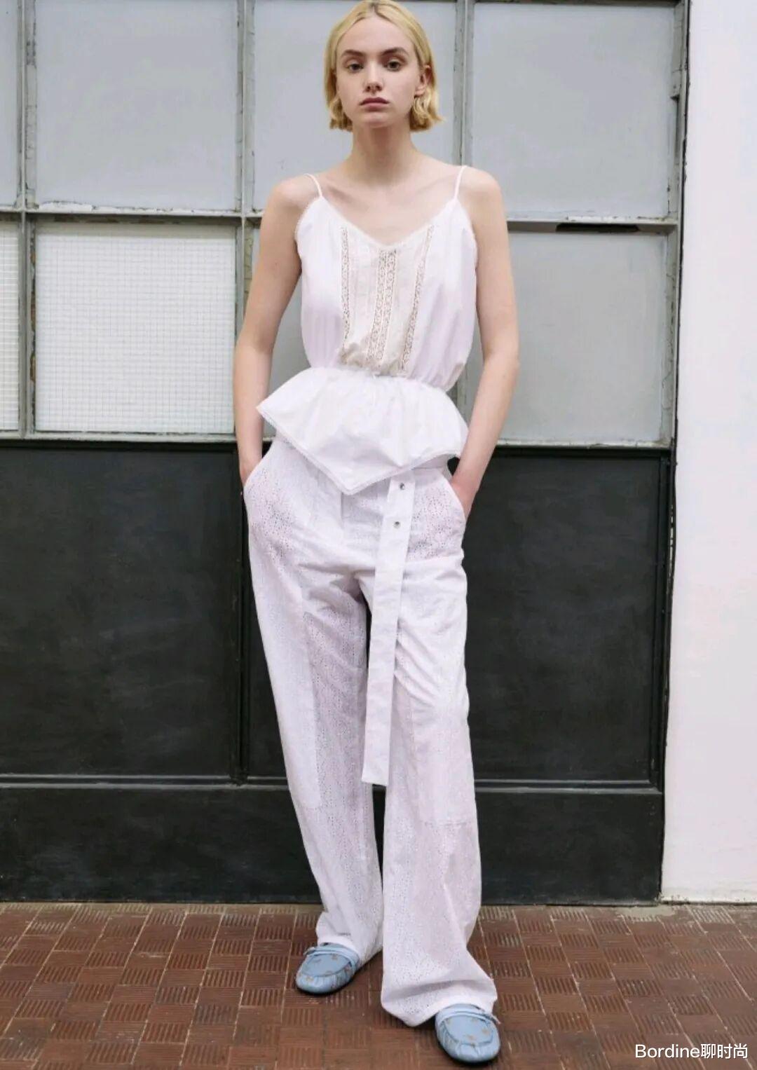 白色颜色为主的服装在吊带上衣和直筒裤的搭配多了一些套装的休闲感,还在吊带的上衣以腰带的收束设计、不规则下摆线条等设计,让套装也在细节之上增加了更多的潮范儿。
