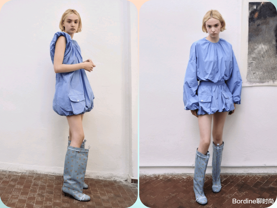 蓝色的颜色在冷色调的之中,纯色的颜色多了极简的简约气质,在服装上以蓬松的夸张造型也多了一些廓形线条感,结合了褶皱等元素,也让纯色的服装有着更多的细节设计感。
