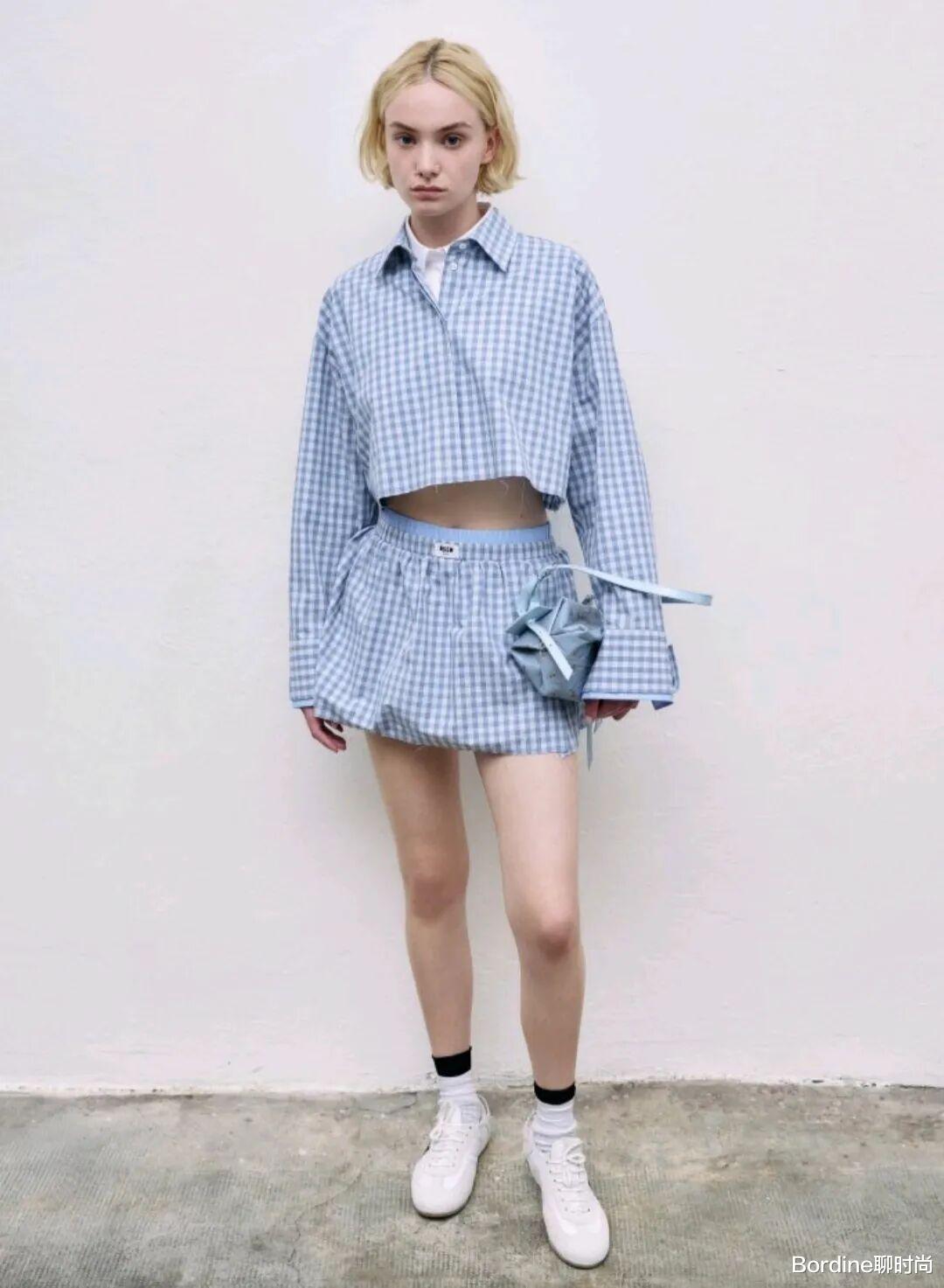 蓝色格纹的套装在清新的优雅中,简约的格纹的经典复古,还在套装裙的优雅温婉,结合了露腰设计、蓬松廓形等设计,为格纹套装增加不少的时尚气息。