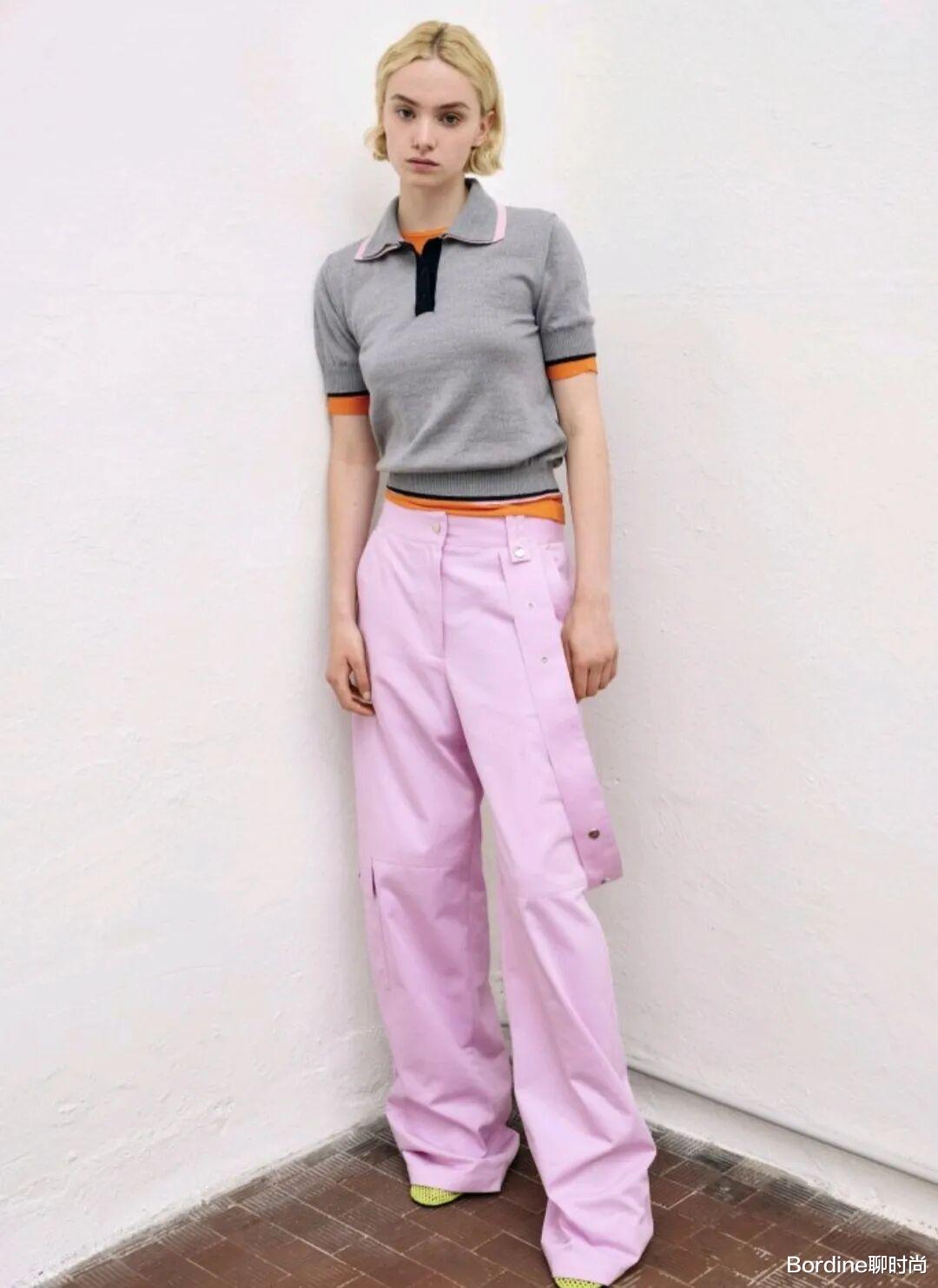 短袖的POLO衫元素的上衣在休闲日常中,灰色的低调稳重,在和鲜艳的橙色等颜色的搭配,多了一些温暖能量和层次的细节感;以粉色直筒裤的搭配在线条元素的装饰有着不少细节的设计感亮点。