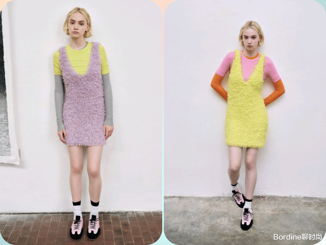 背心款式的裙装在简约的款式中,优雅大方,而在粉色和黄色之间的搭配,鲜艳的颜色在色彩的对比中,撞色冲击也带来了 更为强烈的对比感,休闲的内搭在和裙装的搭配也增加了更为鲜明的层次质感。