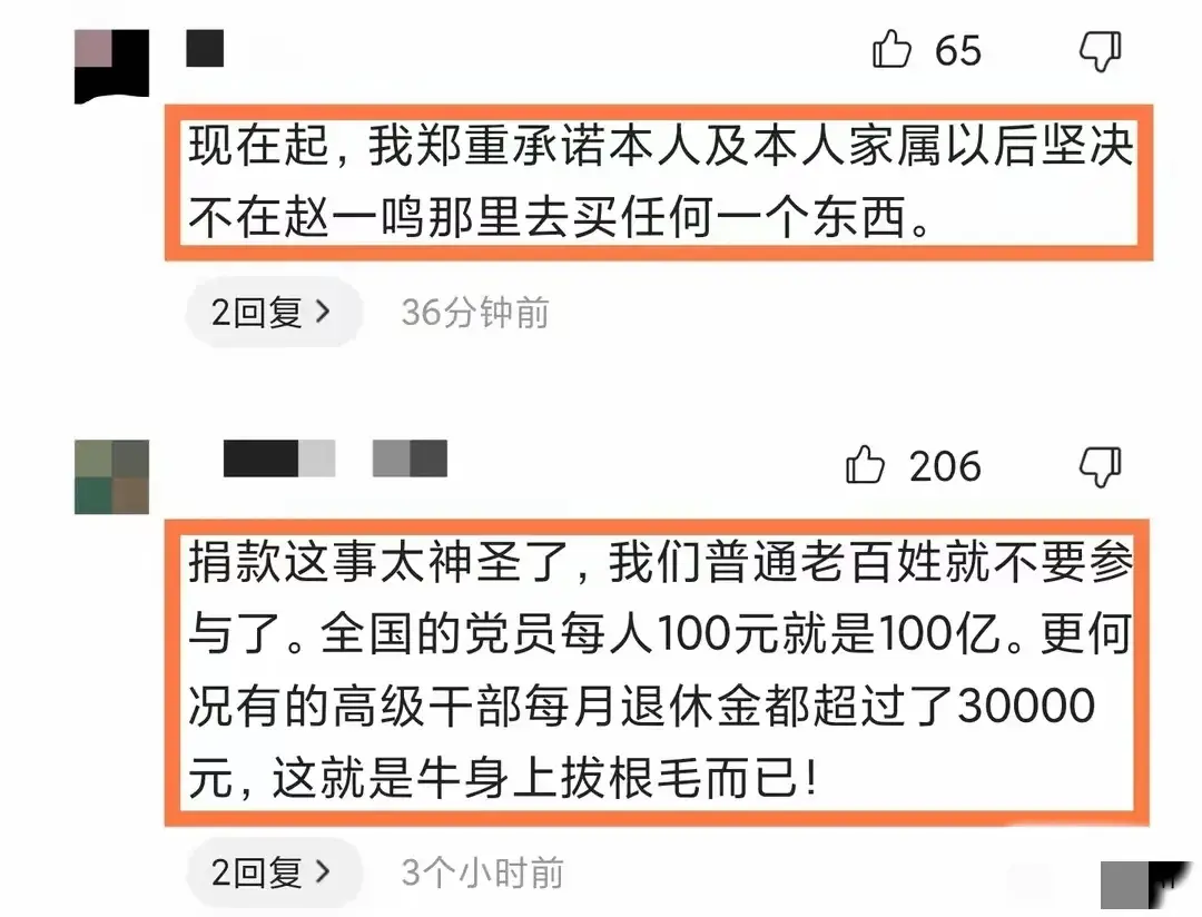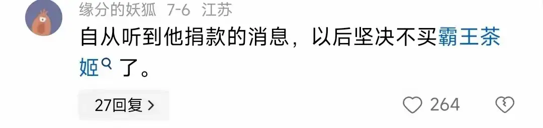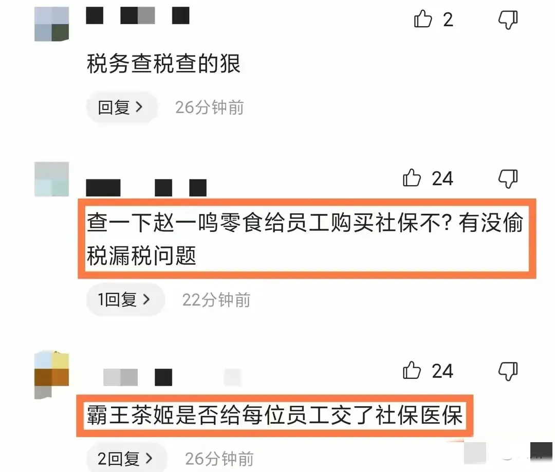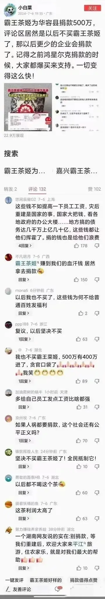 另外,不仅仅是卖零食的被抵,制,霸王茶姬这家企业同样捐了 500 万,其相关评论区依然能清晰看到众多网友留言举报该企业,还有网友强烈提议,大家应联合起来举报这些捐款的企业,查查他们有无偷税漏税,查查他们对待员工是否严格执行劳动法。