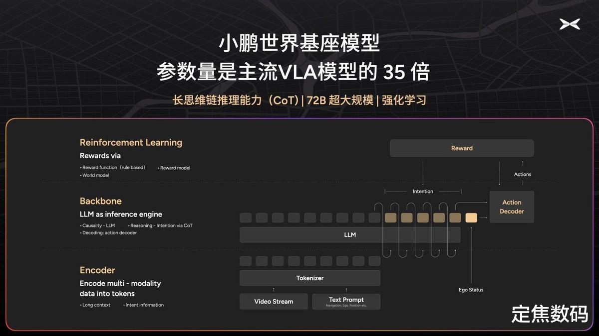 720亿参数啥概念?比主流模型大35倍!目前主流的自动驾驶模型参数大概在几十亿级别,而小鹏这个直接干到720亿,相当于给AI塞了35倍的“脑容量”。负责人说,这模型不光能看懂摄像头画面、导航信息,还能像人类一样“推理思考”。比如遇到突发情况,它能自己分析“该刹车还是转向”,然后把指令传给方向盘和刹车系统。更夸张的是,它还能通过强化学习不断进化,处理那些训练数据里压根没见过的极端场景,目标是做到“比人类司机更靠谱”。
