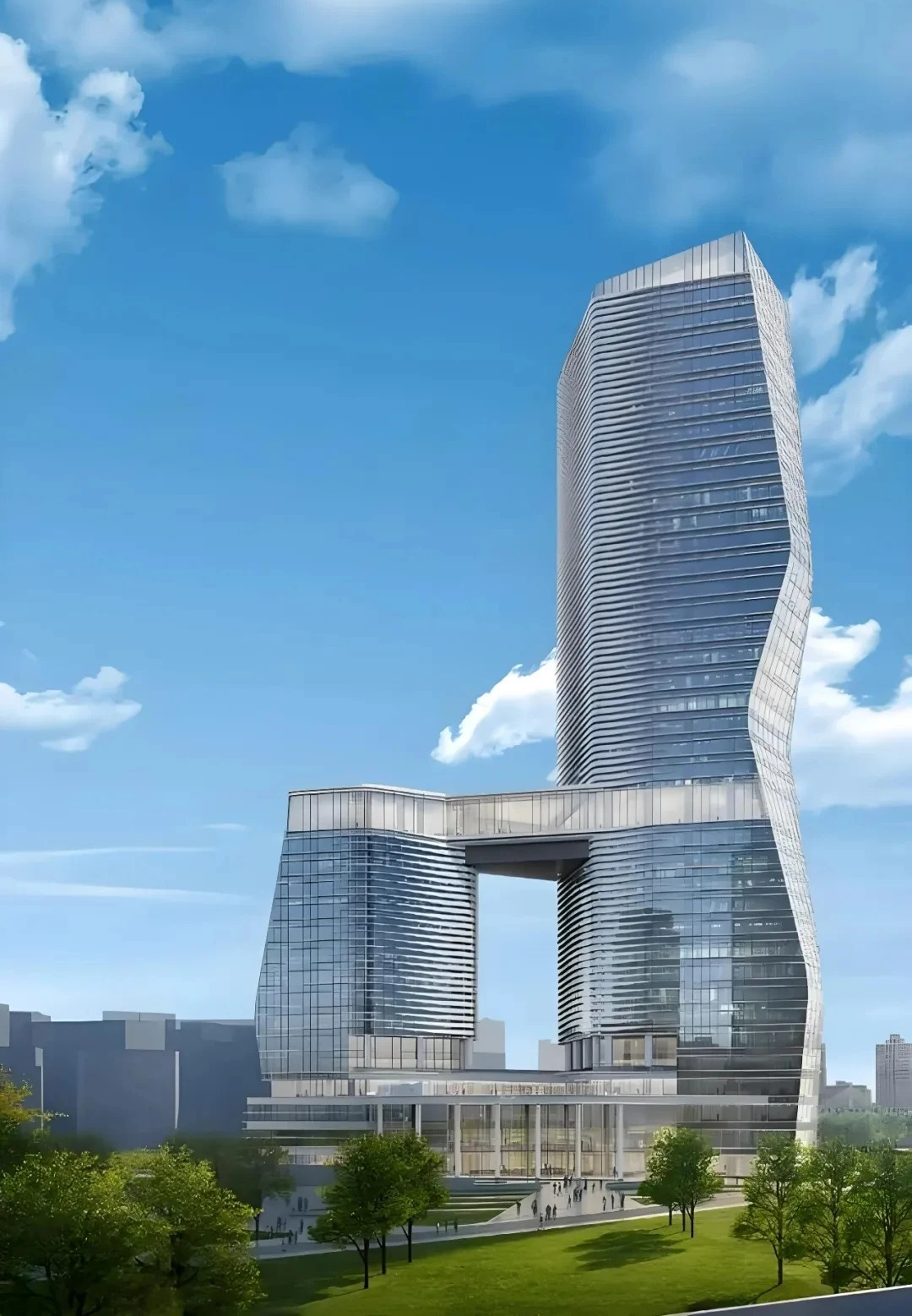 项目坐拥中央商务区临海一线,总建筑面积超过15万平方米,由主副双塔构成。主塔约179.95米、共37层,副塔83米、16层,两塔之间通过高空连廊衔接,整体轮廓犹如一艘蓄势待发的帆船,向海而立。