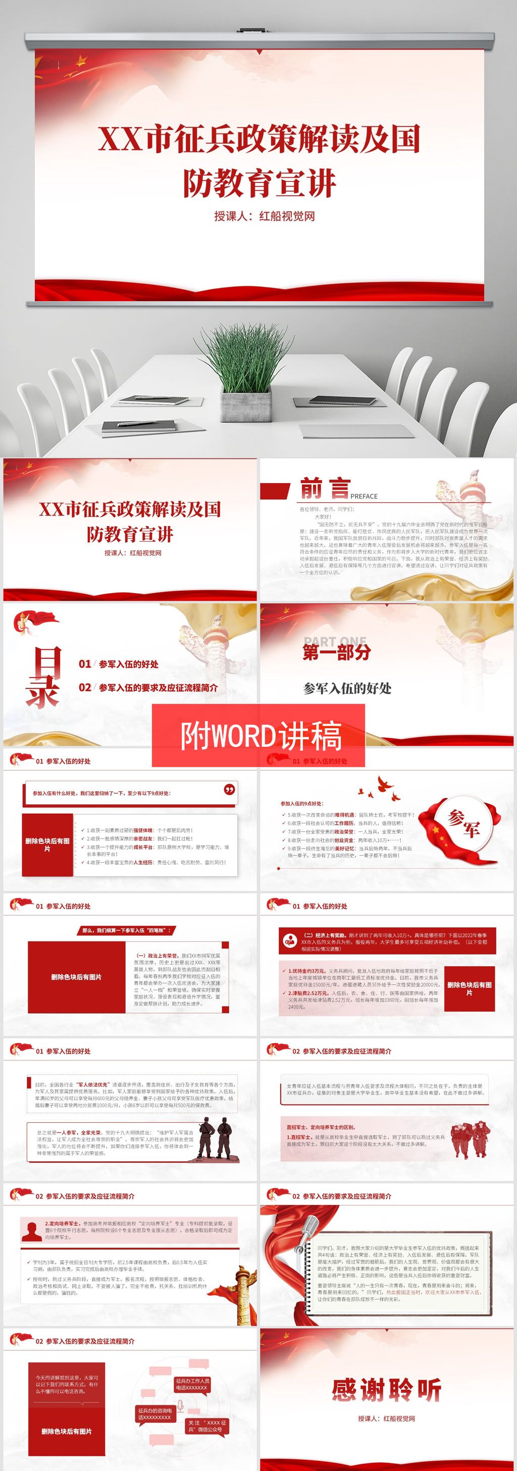 “国无防不立,民无兵不安”。新时代的强军目标是:建设一支听党指挥、能打胜仗、作风优良的人民军队,把人民军队建设成为世界一流军队。近年来,我国军队面貌日新月异,战斗力稳步提升,同时部队对高质量人才的需求也越来越大,这也意味着广大的青年入伍服役后发展机会将越来越多。参军入伍是每一名符合条件的应征青年应尽的责任和义务,作为即将步入大学的新时代青年,我们更应该主动承担起这份重任,积极响应党和国家的号召。下面,我从政治上有荣誉、经济上有奖励、入伍后发展、退伍后有保障等几个方面进行宣讲,希望通过宣讲,让同学们对征兵政策有一个全方位的认识。