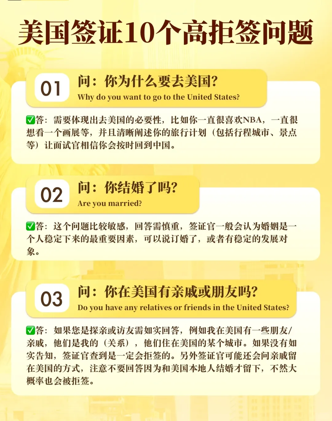问题所在:模糊的回答,会让面试官觉得“你对未来没有规划,有随时滞留美国的可能”;如果回答前后矛盾(比如前面说“工作稳定”,后面又说“说不定会换工作”),会被判定为“不诚信,有隐瞒”,进而怀疑你有移民倾向。