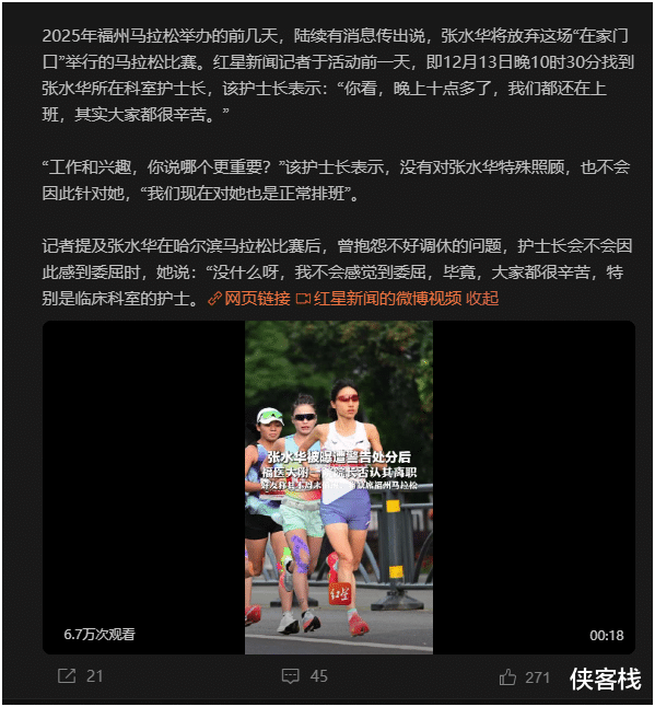 毕竟护士是她的工作,跑马拉松只是她的爱好。当爱好与工作冲突,她只能选择其一。或者在不影响工作的情况下继续跑马拉松,或者辞职专业跑马拉松。