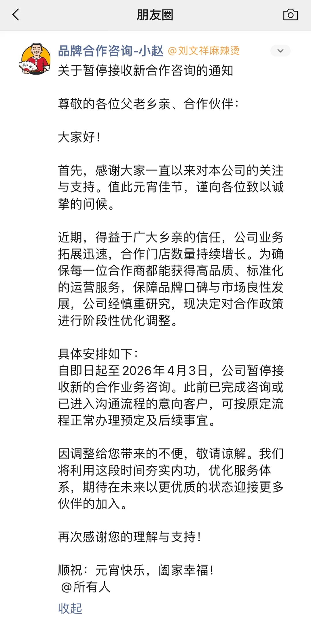 面对这突如其来的“泼天富贵”,品牌方的反应却出人意料。就在流量达到顶点的3月2日,刘文祥麻辣烫官方发布通知,宣布即日起至4月3日,暂停接收所有新的加盟业务咨询。