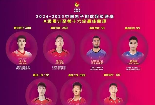 最后,我们来看看累计十六轮的最佳单项技术。保定沃隶的温子华以308分,成为最佳得分王,这得分能力,简直“恐怖”!浙江德清的张冠华,则以259次扣球,荣膺最佳扣球称号,这“暴力美学”的扣球,让人看得热血沸腾!天津食品集团的Esfandiar,以38个ACE球,成为最佳发球手,这发球,简直就是“核武器”!南京广电猫猫的戴海波,以55个拦网得分,成为最佳拦网手,这“万里长城”般的防守,让对手望而生畏!北京北汽的刘泽,以699次有效传球,成为最佳二传手,这“组织核心”般的表现,为球队进攻提供了源源不断的动力!浙江德清的陈翱宇和杨一鸣,则分别以172个一传到位和107次防守,成为最佳一传和最佳防守球员,这“稳定军心”般的表现,为球队提供了坚实的后场保障!