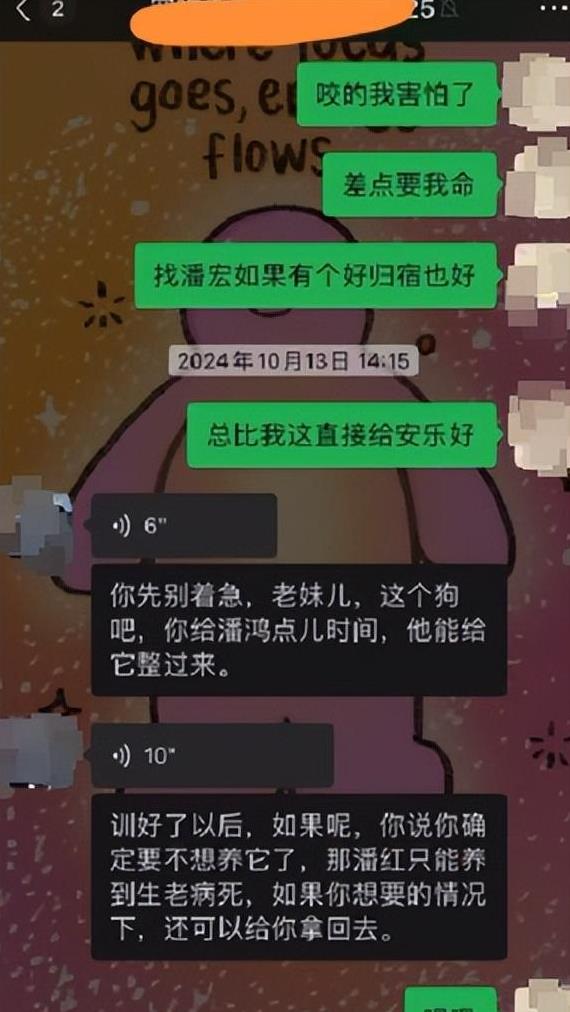 在纠结了几天后鲍女士想将自己的狗接回来,于是联系了潘宏的工作人员“老叔”索要自己的狗。