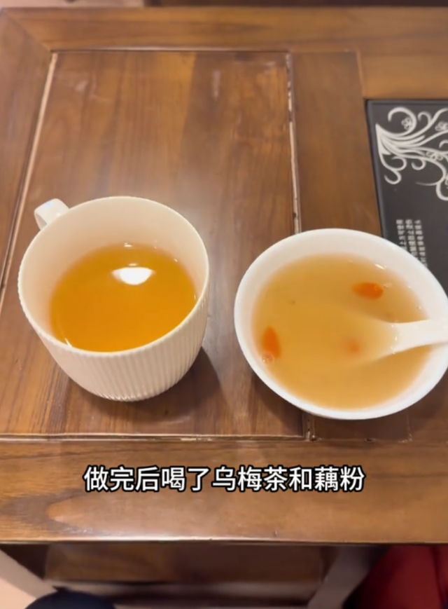 疗程结束后,店里还贴心地准备了乌梅茶和藕粉,帮助顾客补充水分,这些小细节让人感觉很用心。